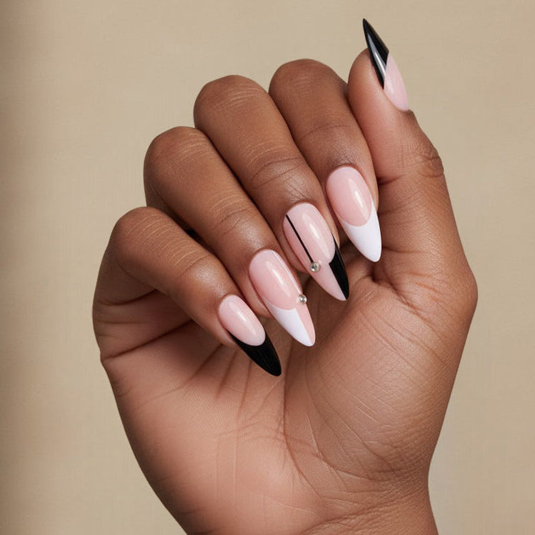 Abstract Black and White French with rhinestones Ready-to-Wear Manicure (press-on nails).