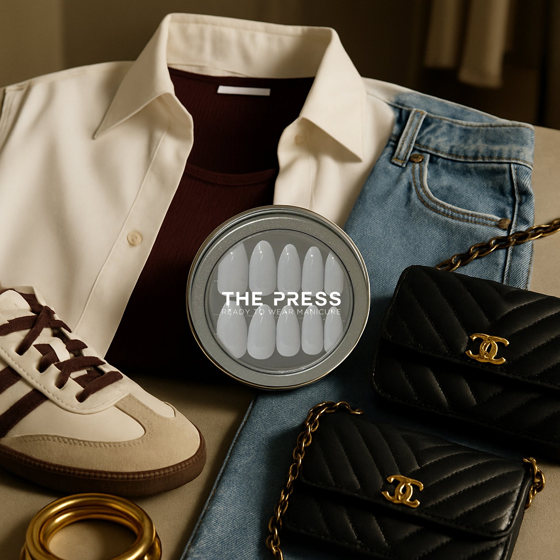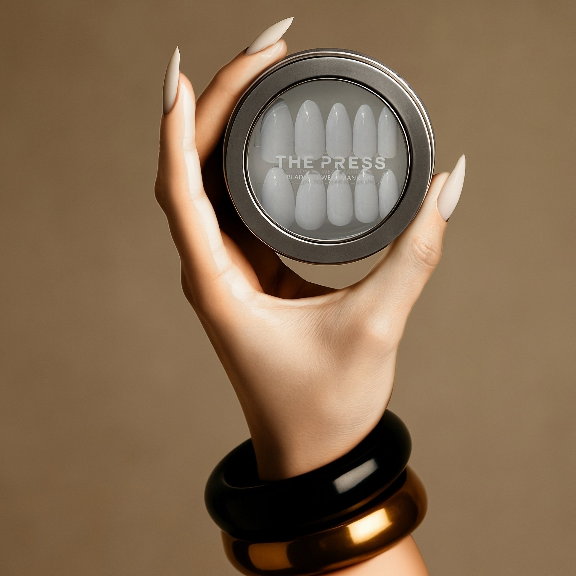 STEP 6: Touch up and reshape your Read-to-Wear Manicure using the file included or a nail clipper. Tip: THE PRESS Nails can be filed from any side, including the cuticle area, if you want to shorten the length of the nails without losing the tip design.
