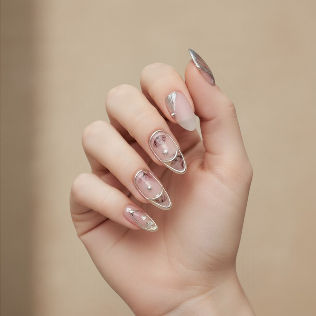 Soft Pink and White Ready-to-Wear Manicure with rose design and 3D design (press-on nails).