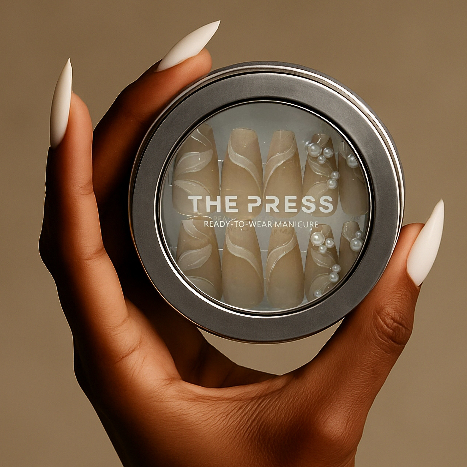 STEP 6: Touch up and reshape your Read-to-Wear Manicure using the file included or a nail clipper. Tip: THE PRESS Nails can be filed from any side, including the cuticle area, if you want to shorten the length of the nails without losing the tip design.