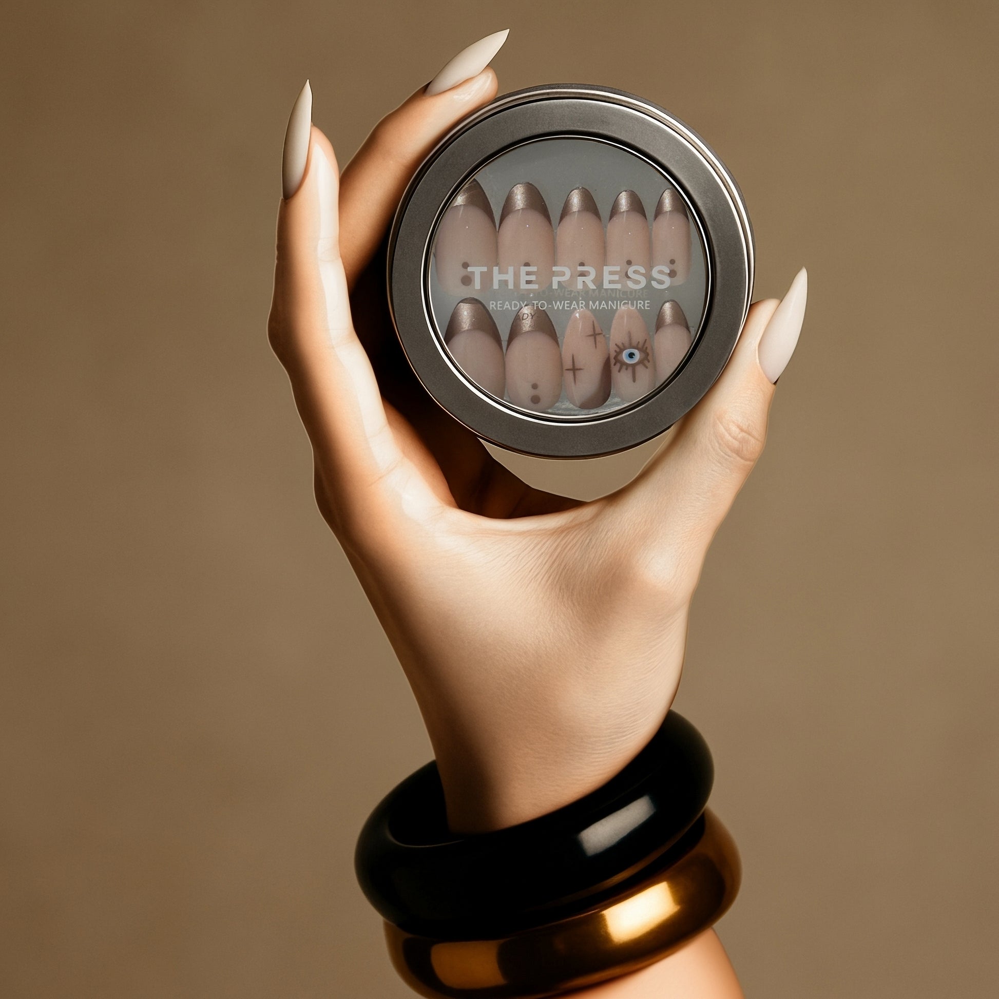 STEP 6: Touch up and reshape your Read-to-Wear Manicure using the file included or a nail clipper. Tip: THE PRESS Nails can be filed from any side, including the cuticle area, if you want to shorten the length of the nails without losing the tip design.