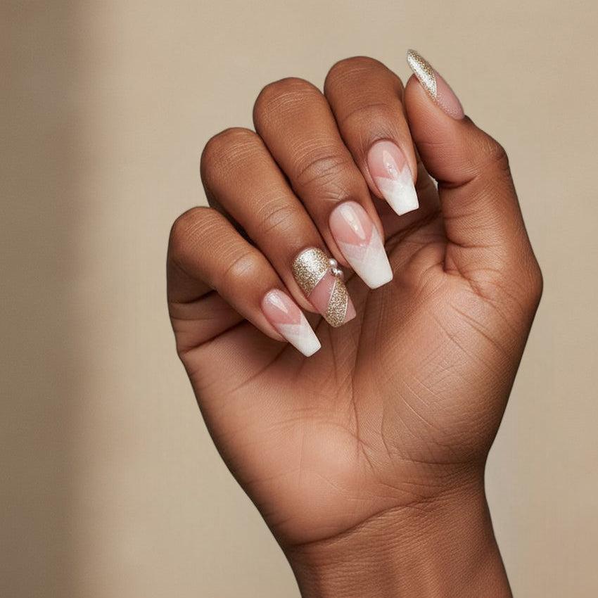 STEP 6: Touch up and reshape your Read-to-Wear Manicure using the file included or a nail clipper. Tip: THE PRESS Nails can be filed from any side, including the cuticle area, if you want to shorten the length of the nails without losing the tip design.