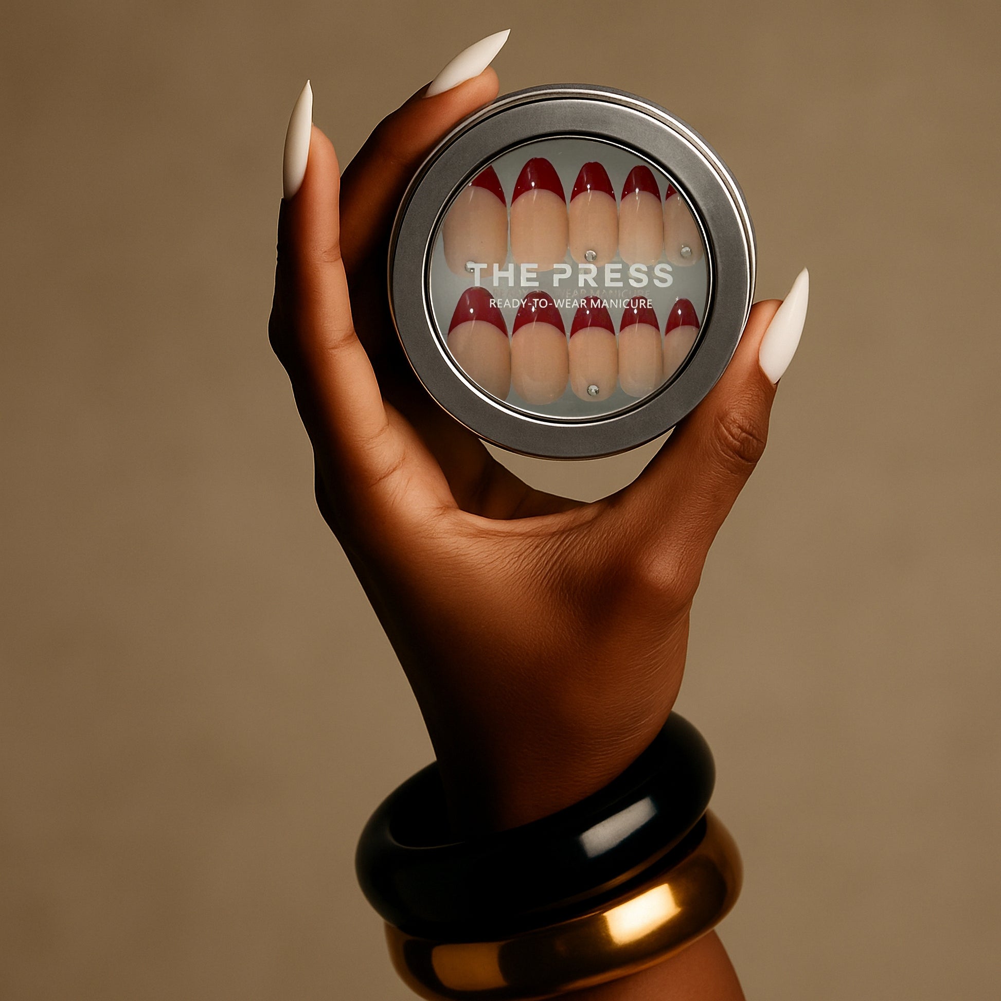 STEP 6: Touch up and reshape your Read-to-Wear Manicure using the file included or a nail clipper. Tip: THE PRESS Nails can be filed from any side, including the cuticle area, if you want to shorten the length of the nails without losing the tip design.