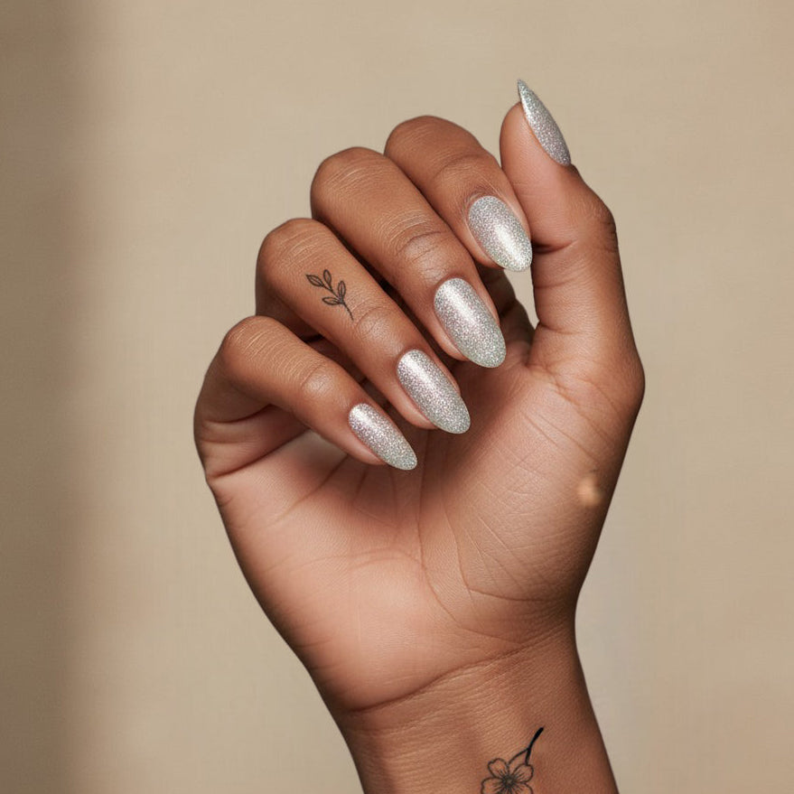 Silver Shimmer Almond Ready-to-Wear Manicure (press-on nails).