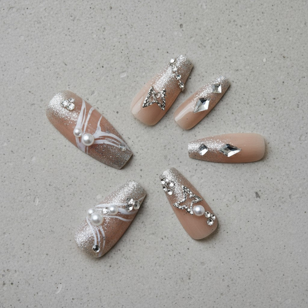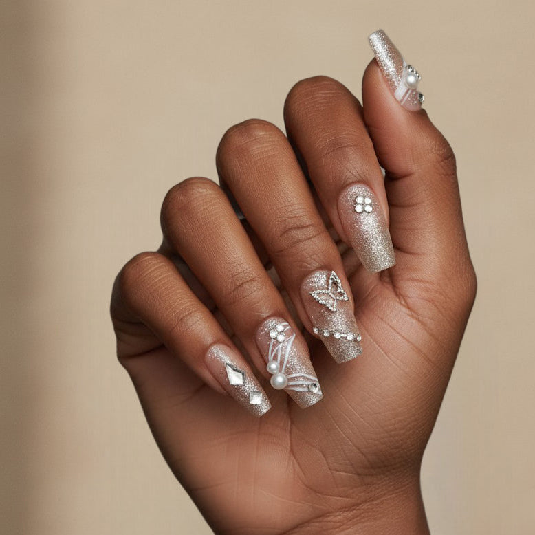 Silver Ombre Ready-to-Wear Manicure (press-on nails) with Butterfly embellishments.